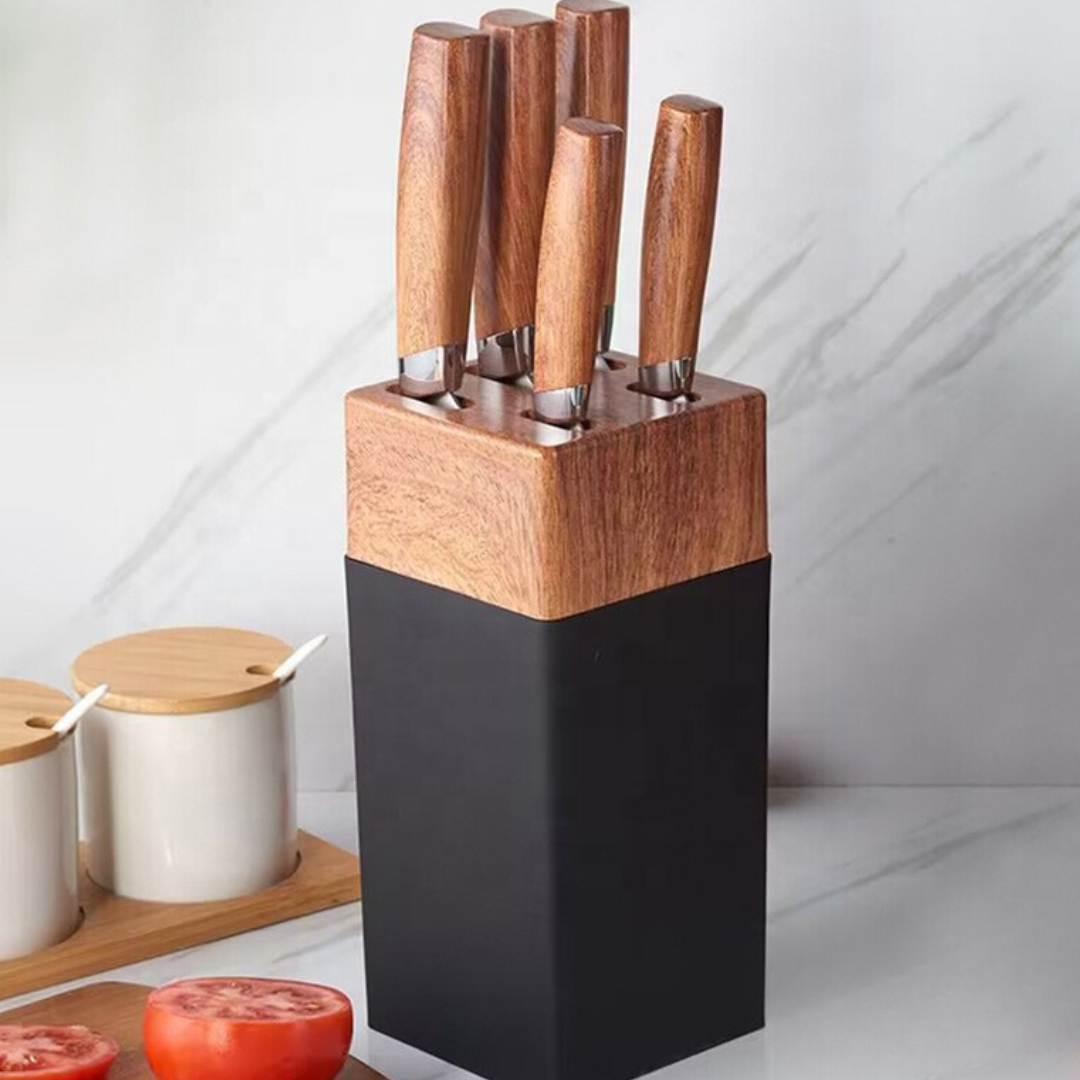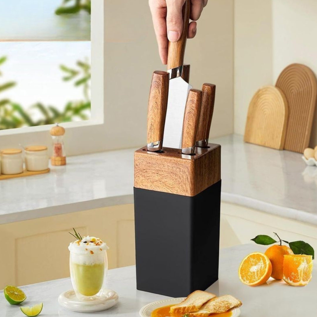 Base Organizadora Incluida: Mantén tus cuchillos ordenados, protegidos y siempre a la mano con un soporte compacto y estilizado.